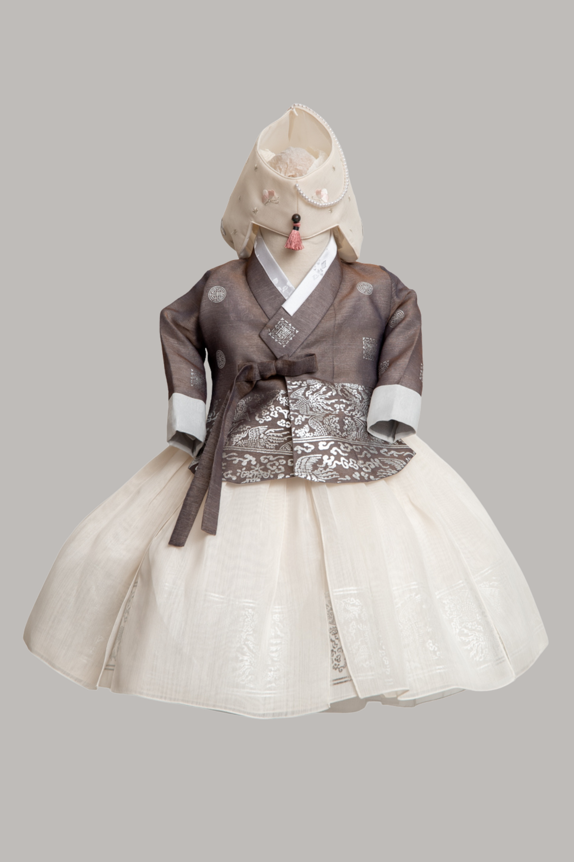 Brown and silver stamped dangui (upper garment) and layered dress.