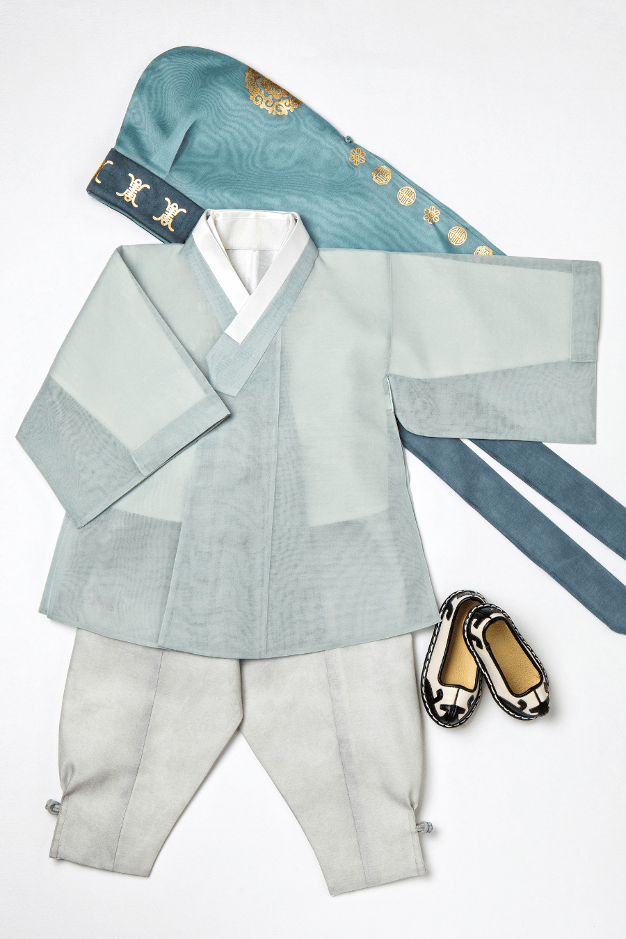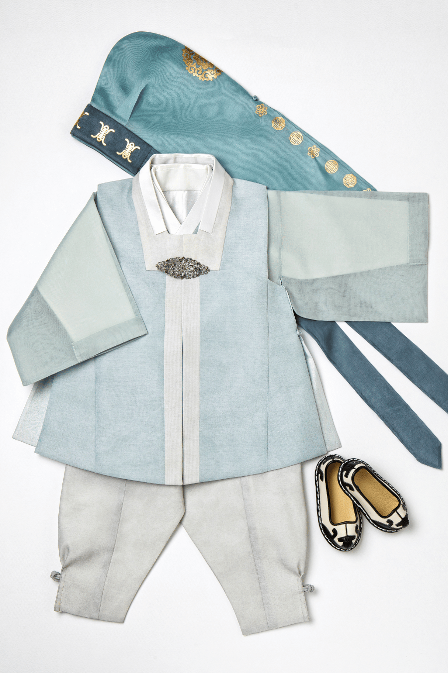 7-piece boy's dohl hanbok (pants, under shirt, jeogori, vest, embroidered silver strap belt, socks, and bokgun hat)