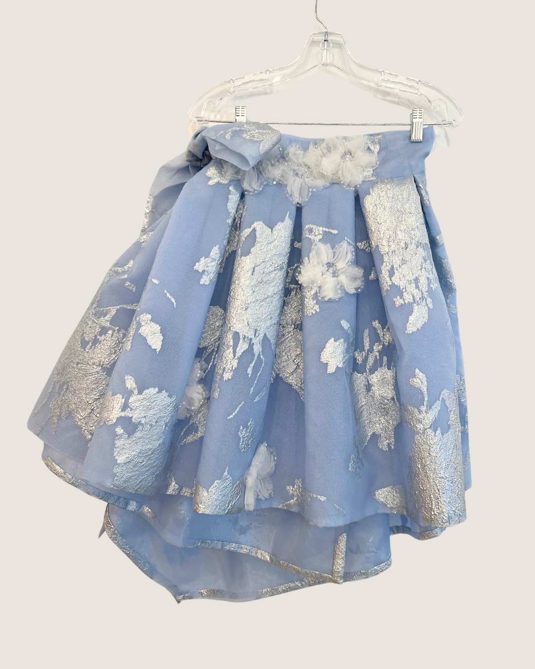 This unique silk wrap skirt features silver embellishments, handmade mesh flowers and hand beaded details.