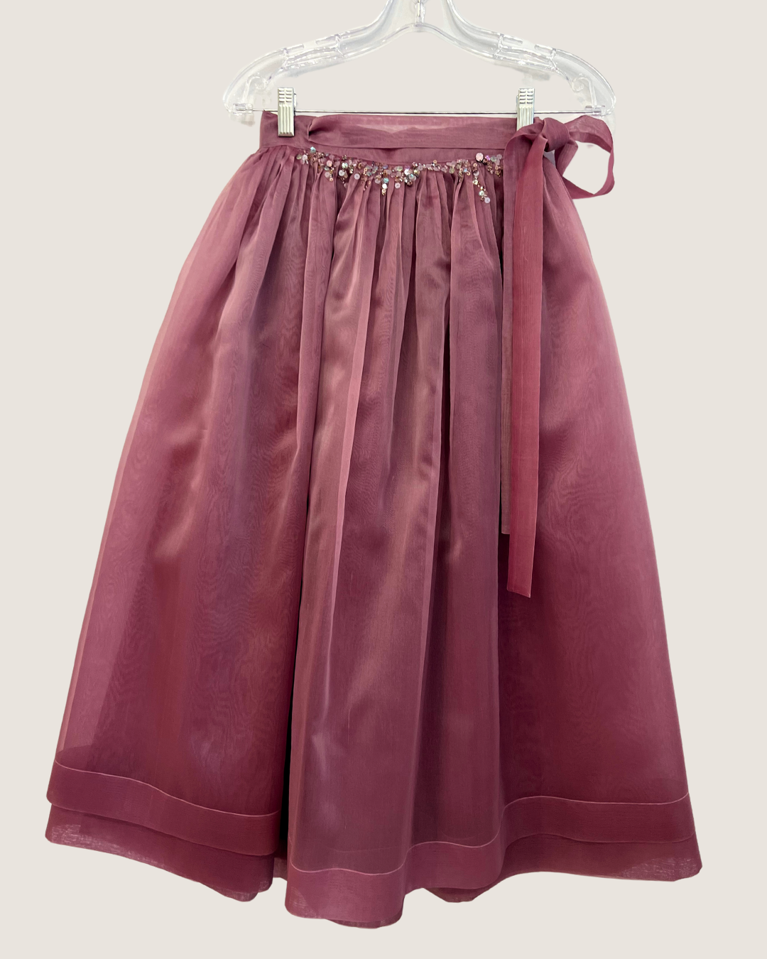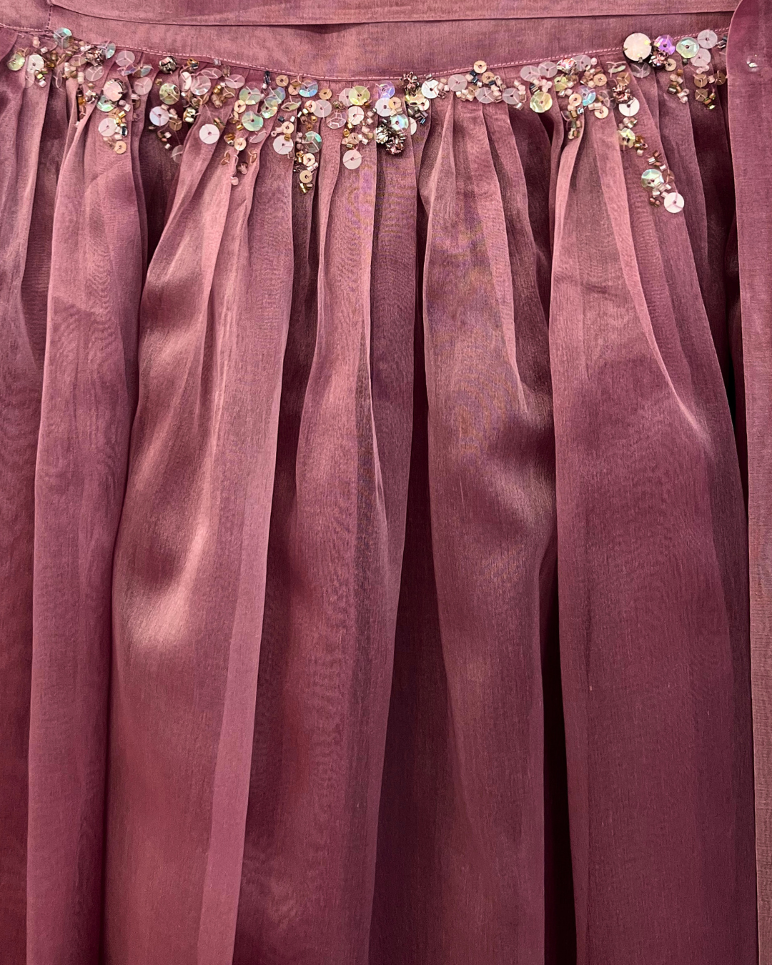 This unique silk wrap skirt features silver embellishments, handmade mesh flowers and hand beaded details.