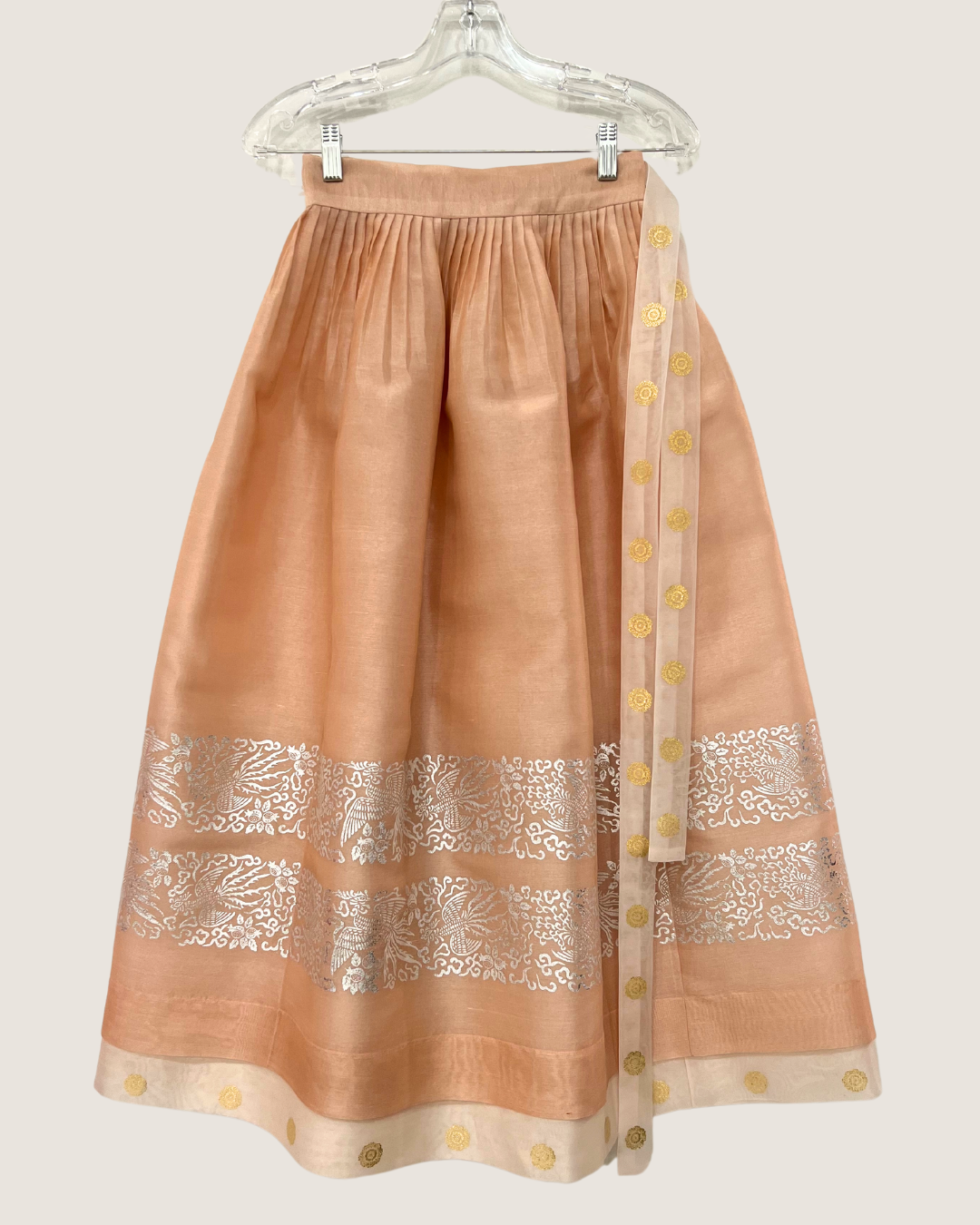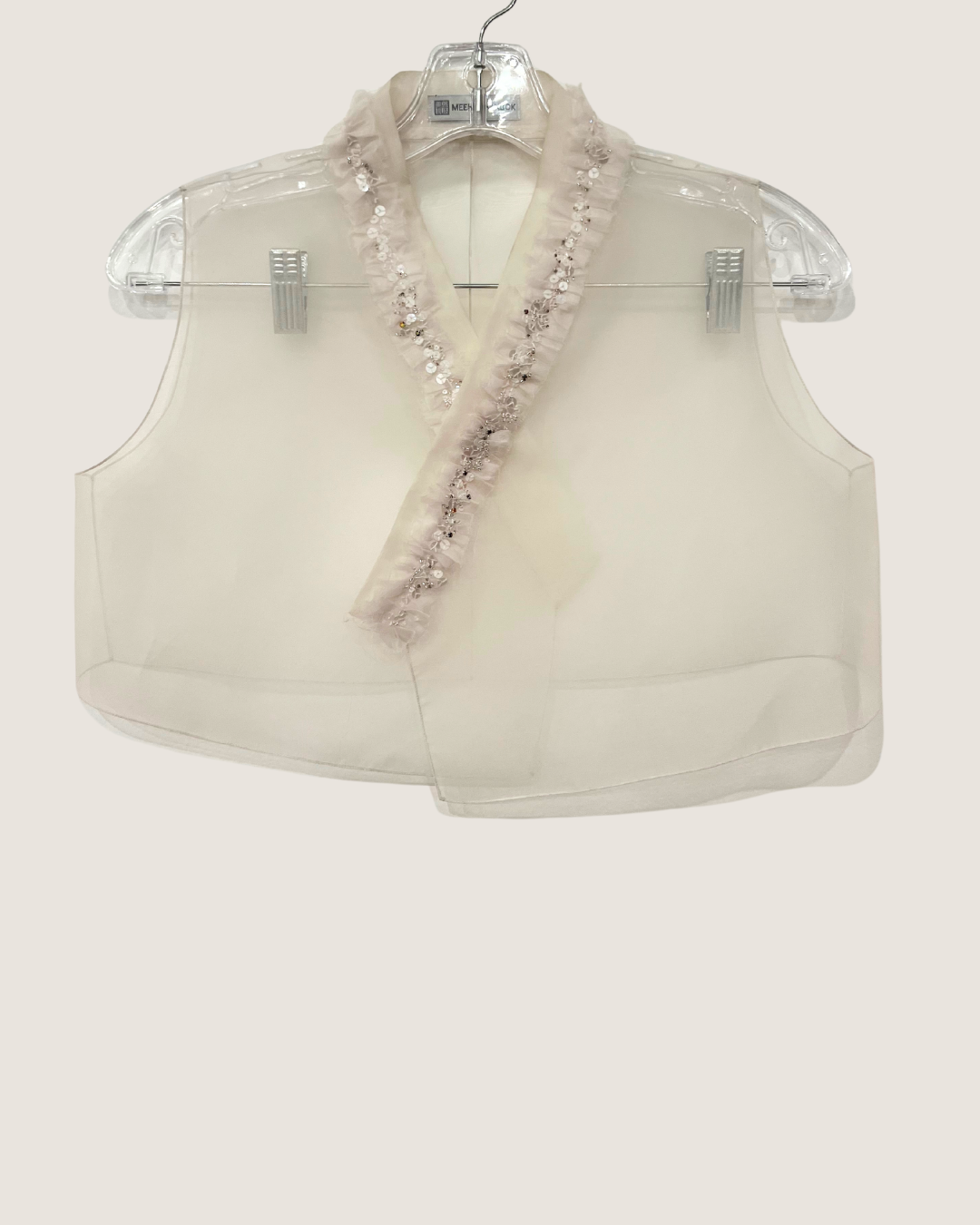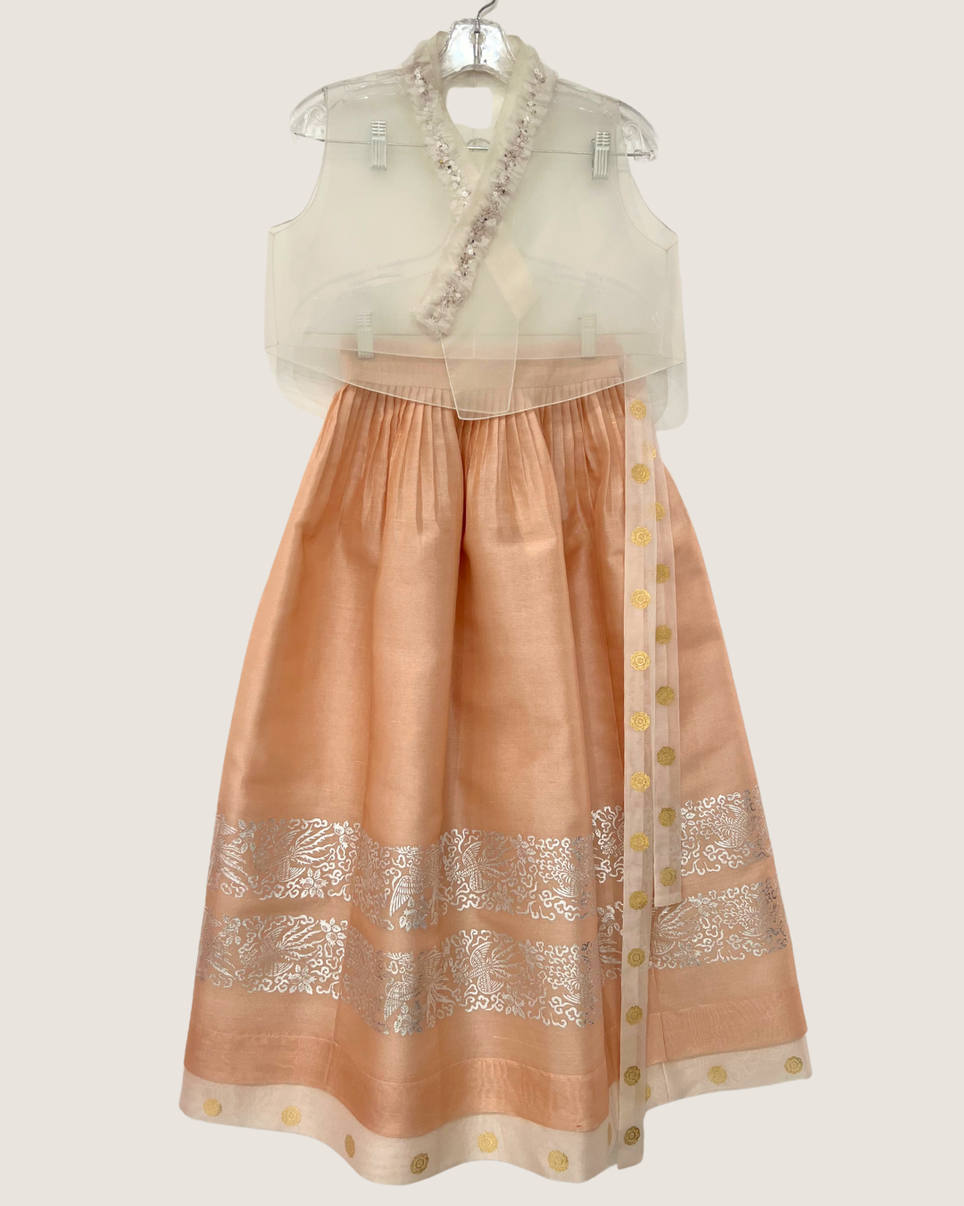 This jeogori and bolero combination is the perfect mix of traditional and modern styles. Silver stamps on 100% silk make this double layered silk skirt feel traditional and elevated. Made with two layers for a bit more volume and pleats around the waist for a more beautiful and detailed shape. The bolero is hand-beaded and sewn with ruffles, creating a festive vibe.