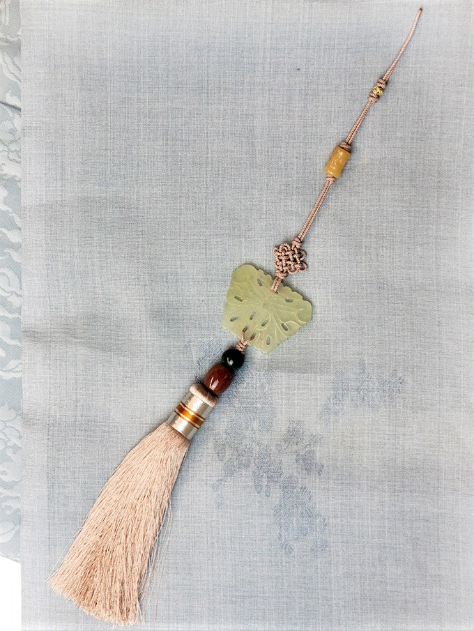 This simple norigae features a hand-cut jade charm, beads, and a silk tassel.