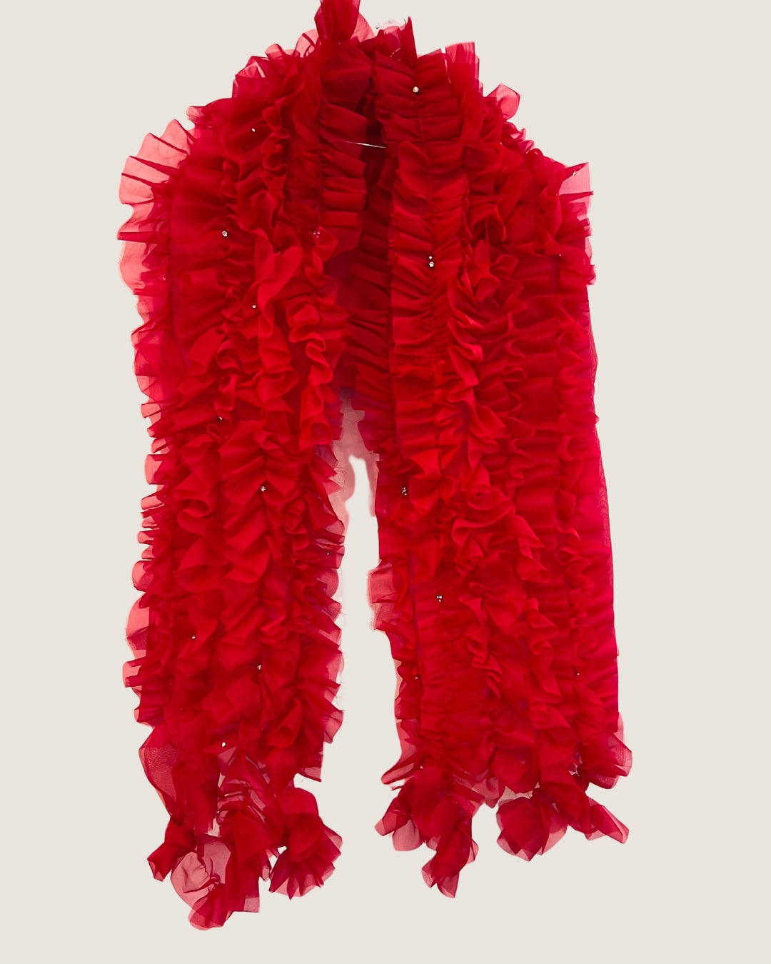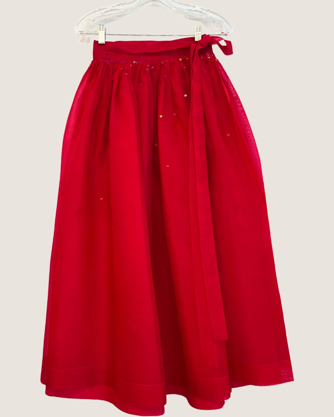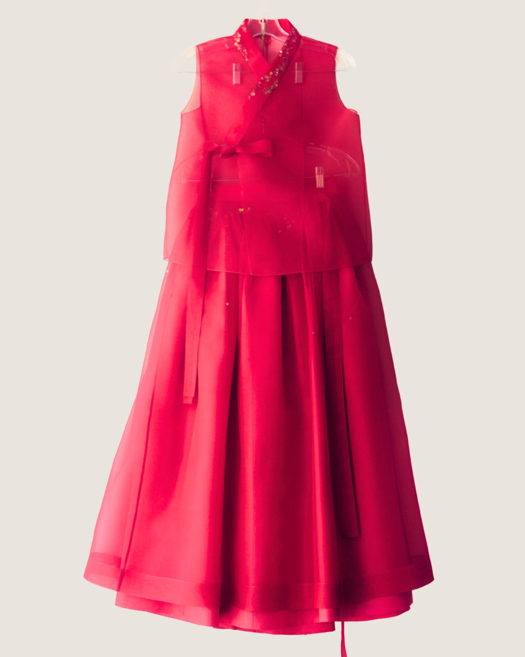 For celebratory moments and extravagant events: This silk 4 piece modern hanbok set contains a translucent hand-adorned jeogori, double layered silk skirt with hand sewn embellishments, silk bustier with transparent shoulder straps, and a long beaded ruffled scarf.