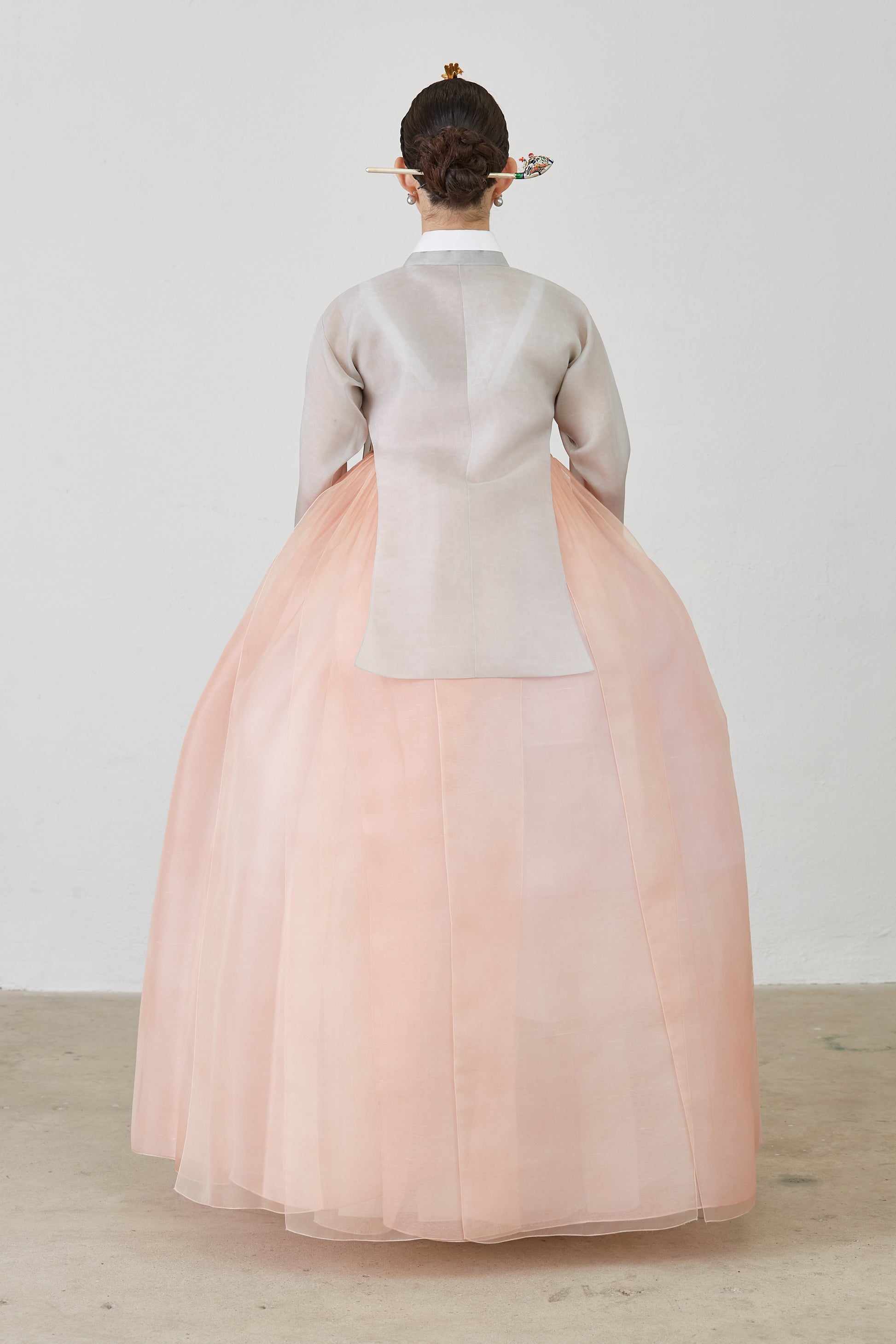 Grey modern danghui paired with a light peach paneled chima (skirt).