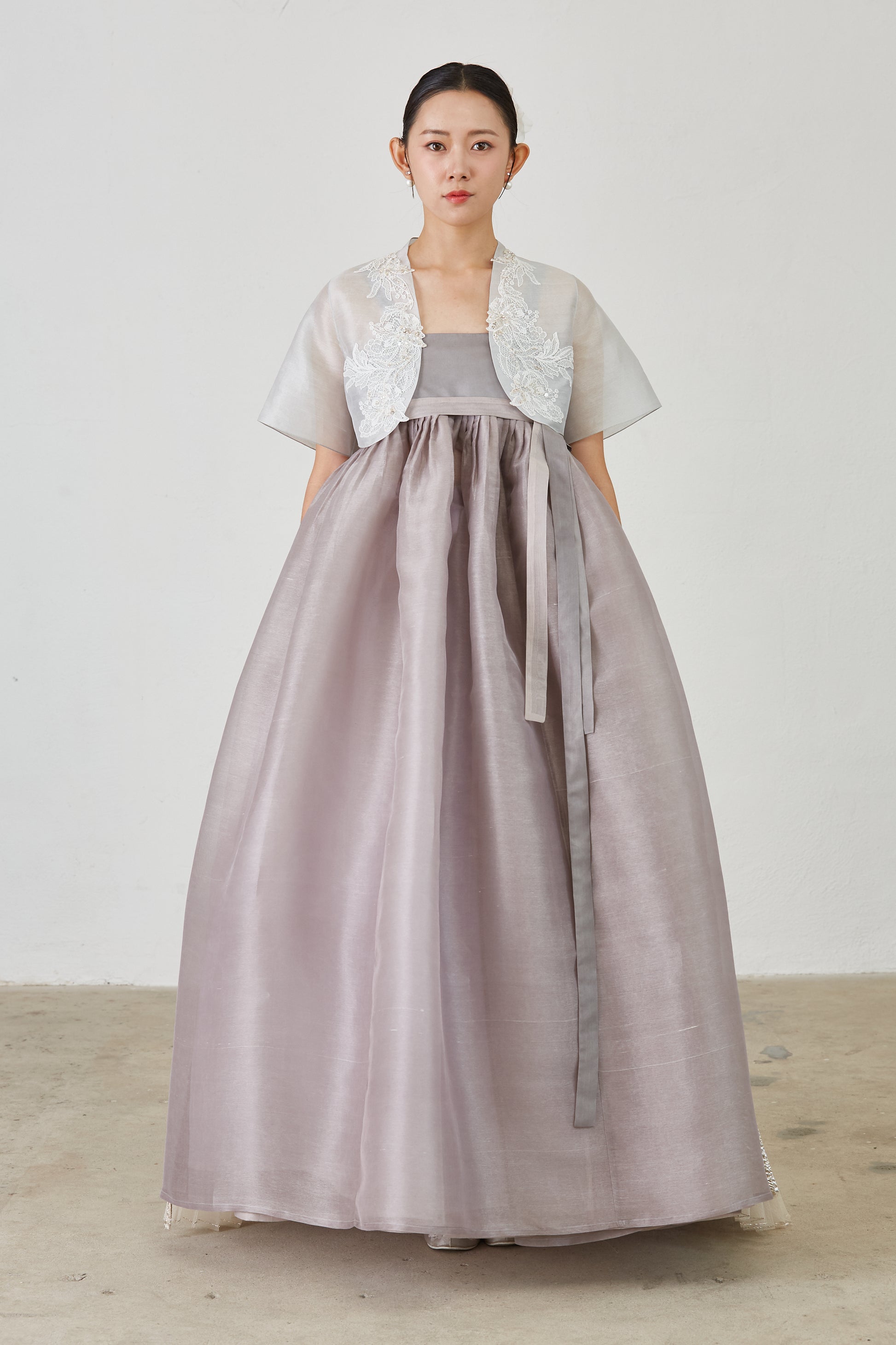 Taupe silk malgi dress with an extravagant pleated gold accented train paired with a short sleeved hand beaded bolero with lace embellishments on the back panel.