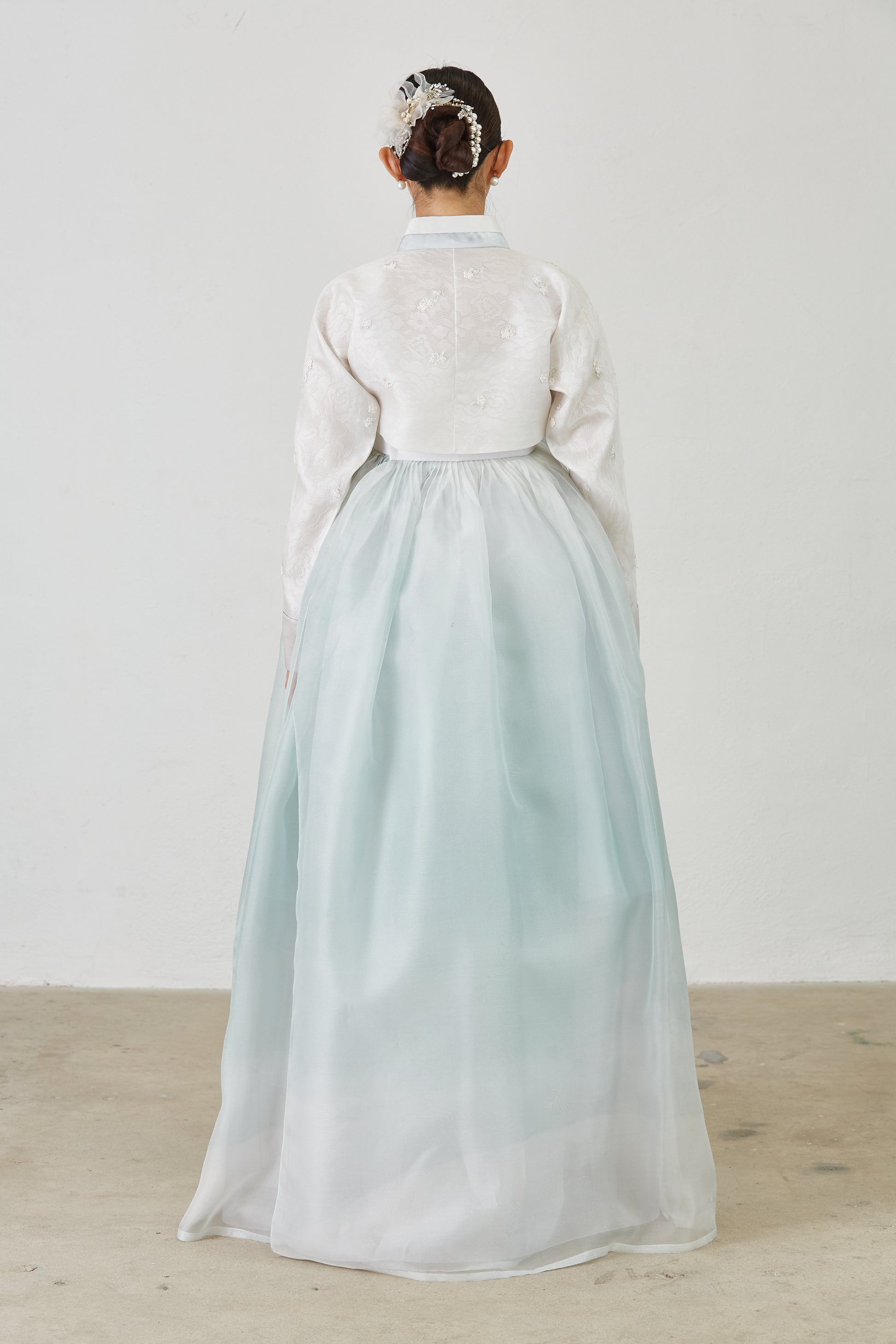 Pale mint ombre chima (skirt) with shiny myeongju silk cuffs, and a jeogori with lace flower motifs and embroidery.