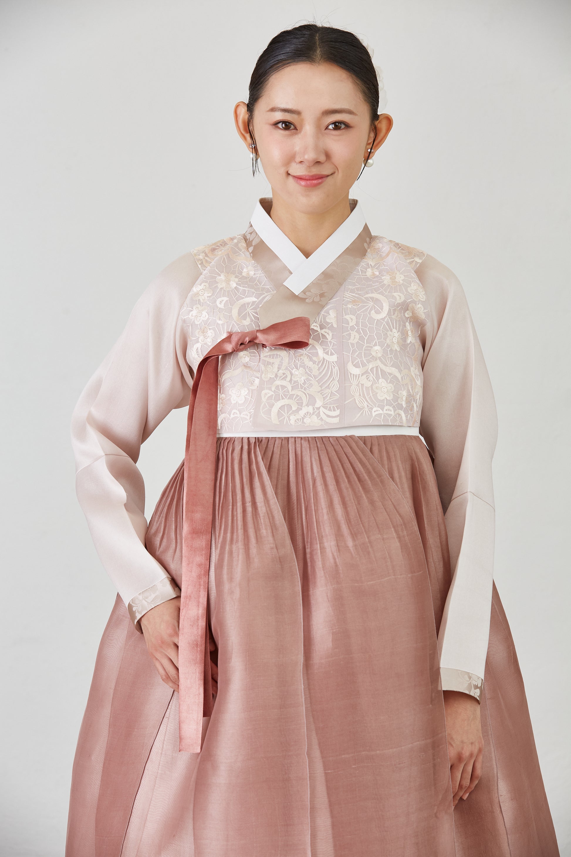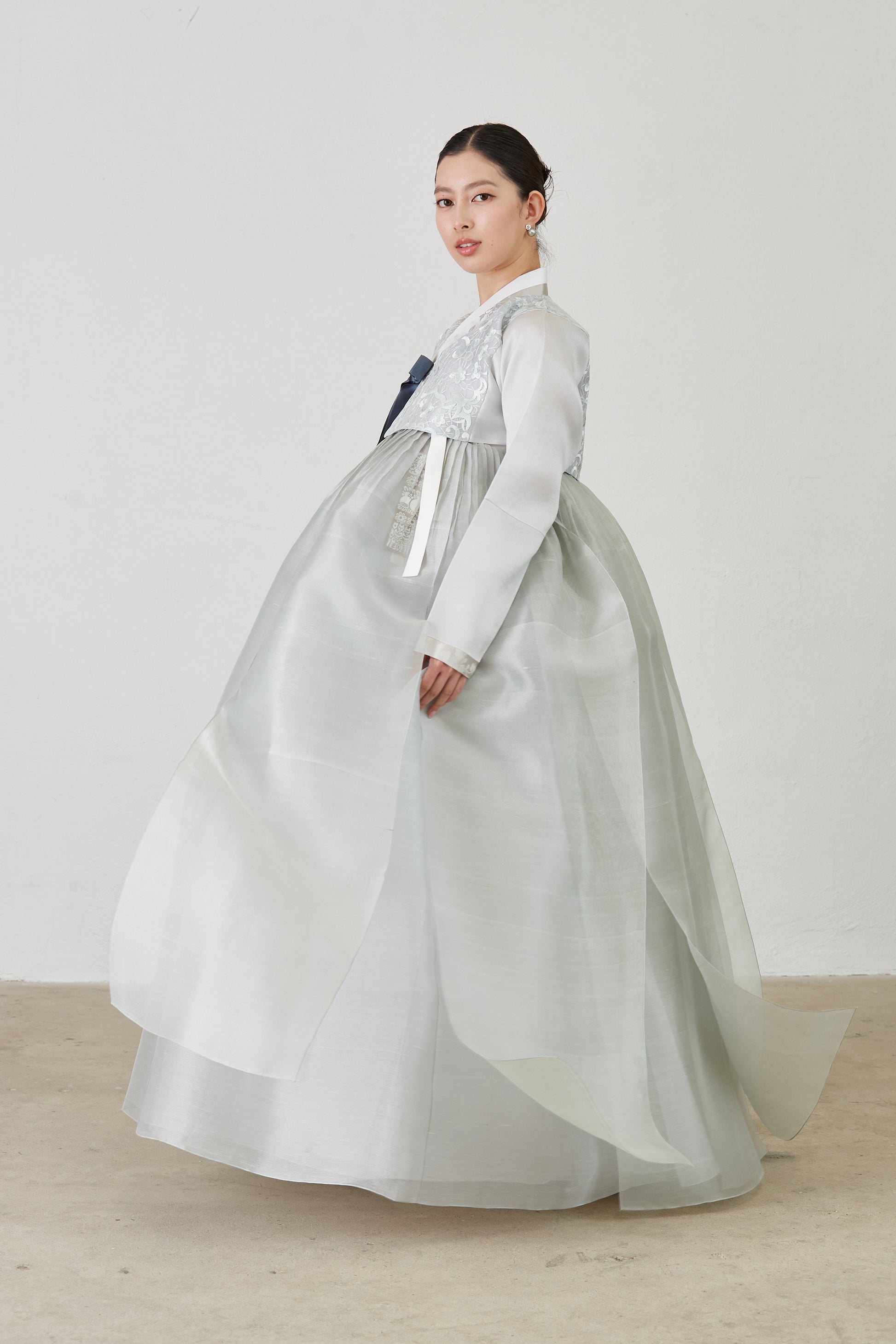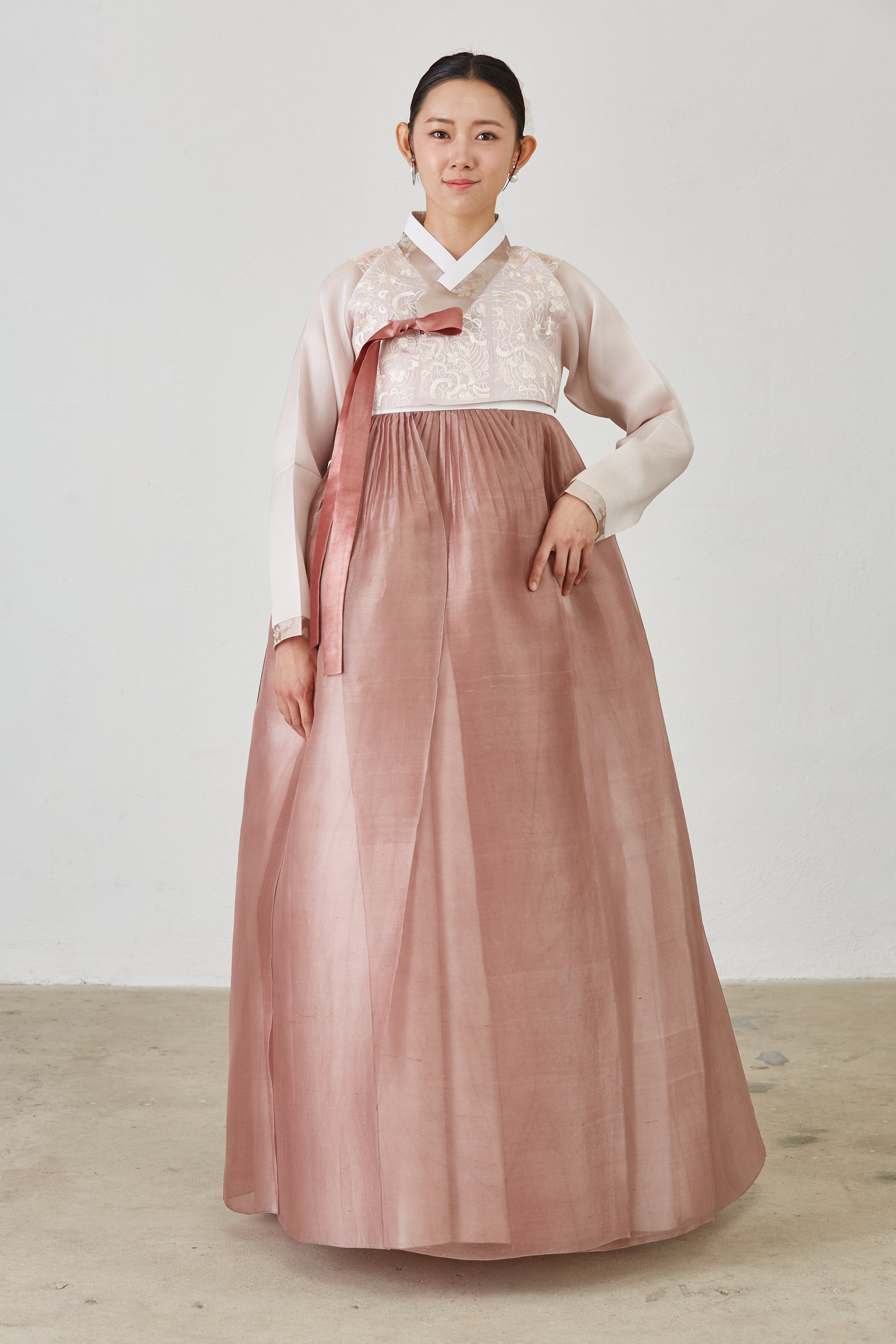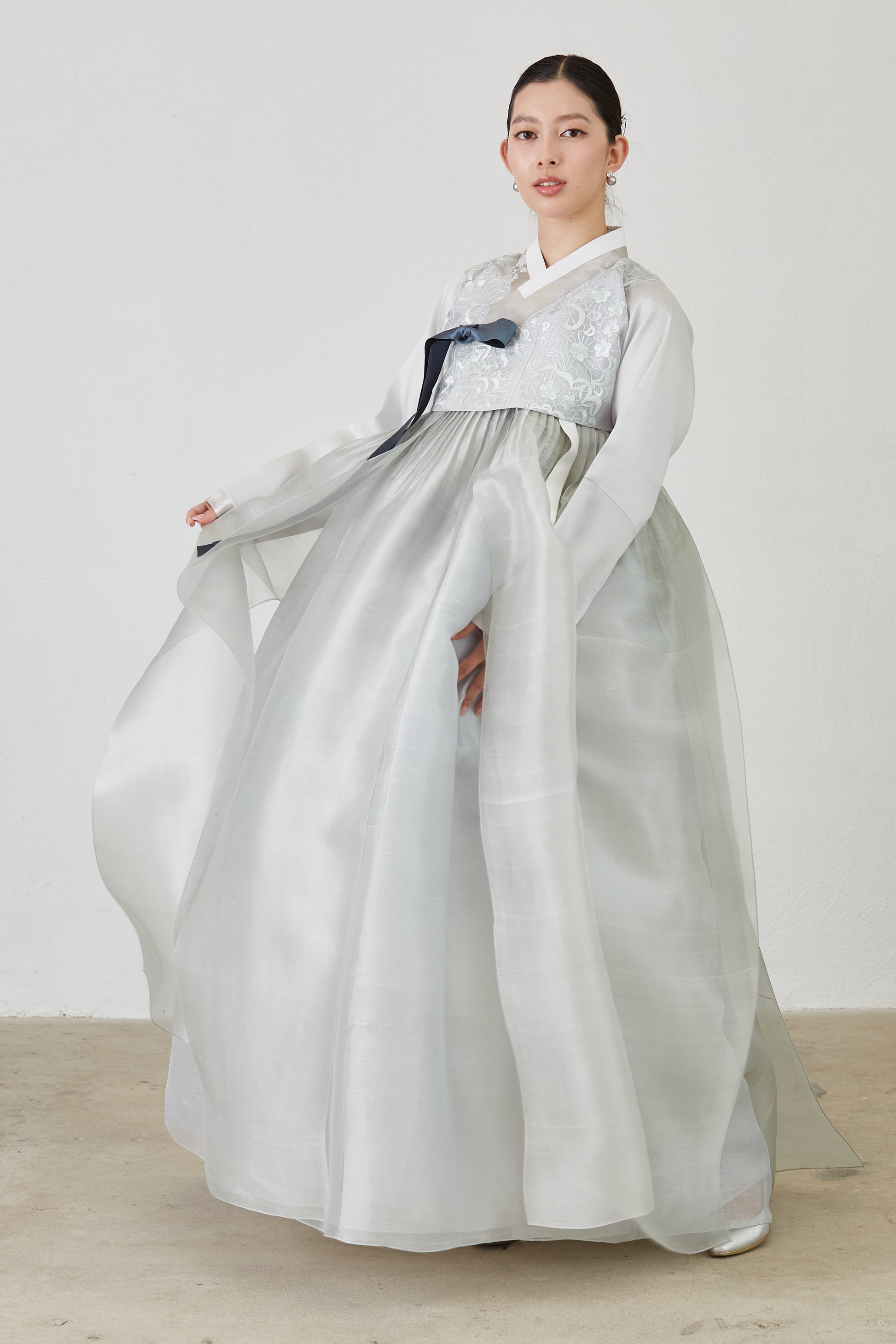 Hand embroidered shiny silk jeogori and double layered oksa silk paneled skirt. Comes in pink or blue option.