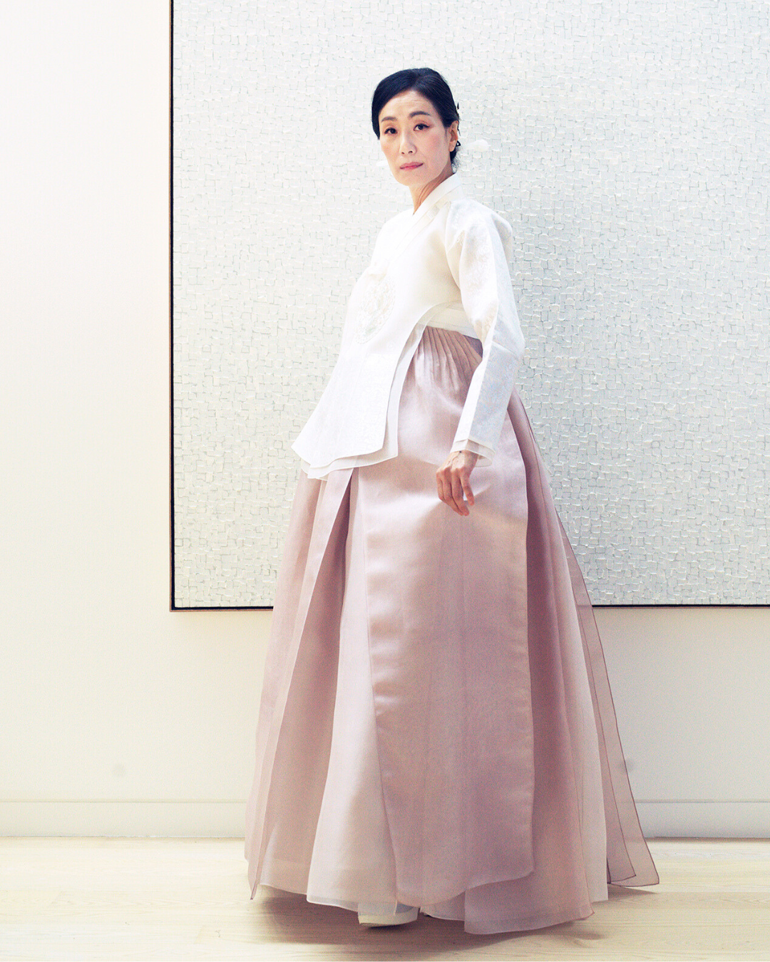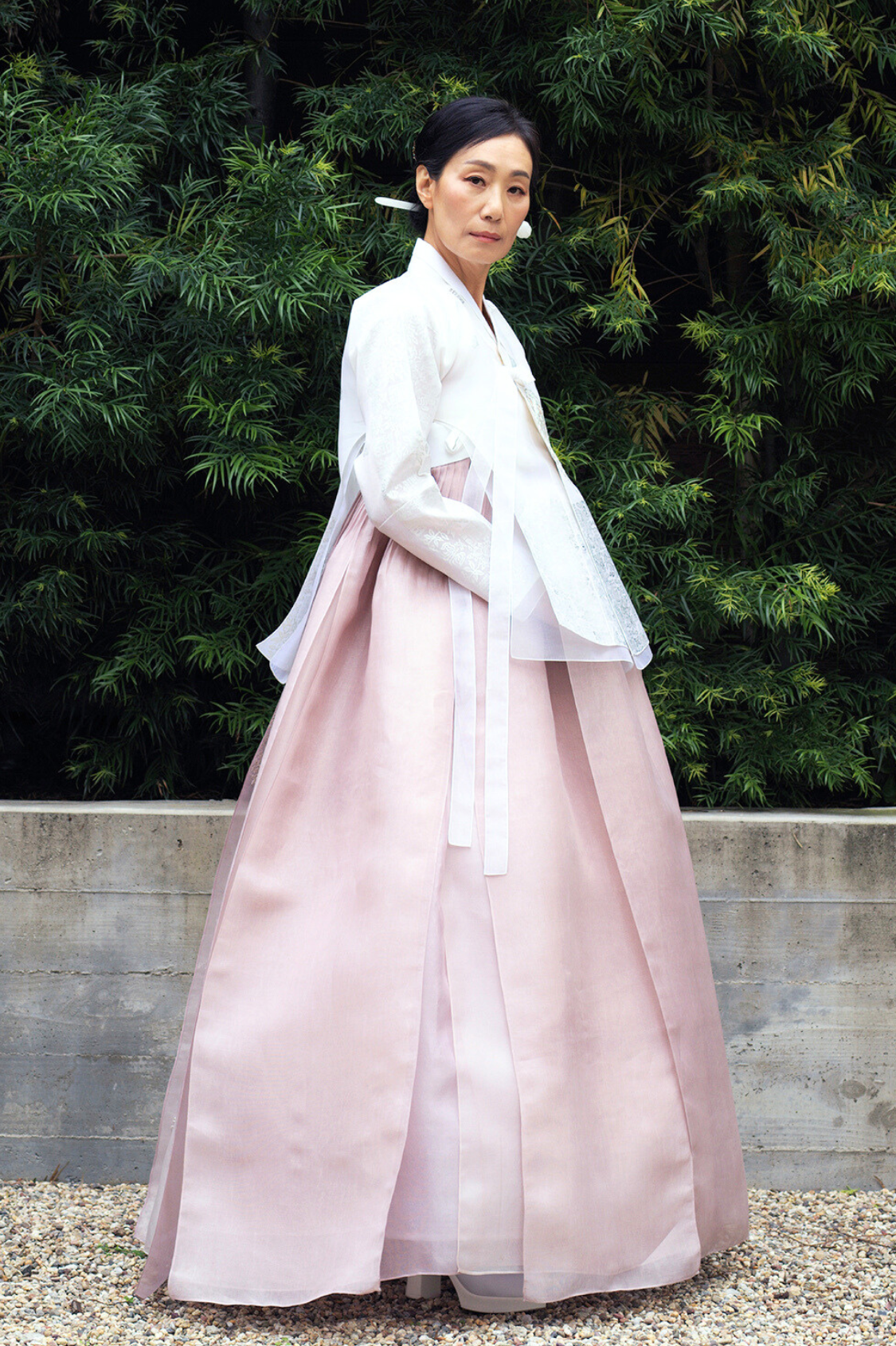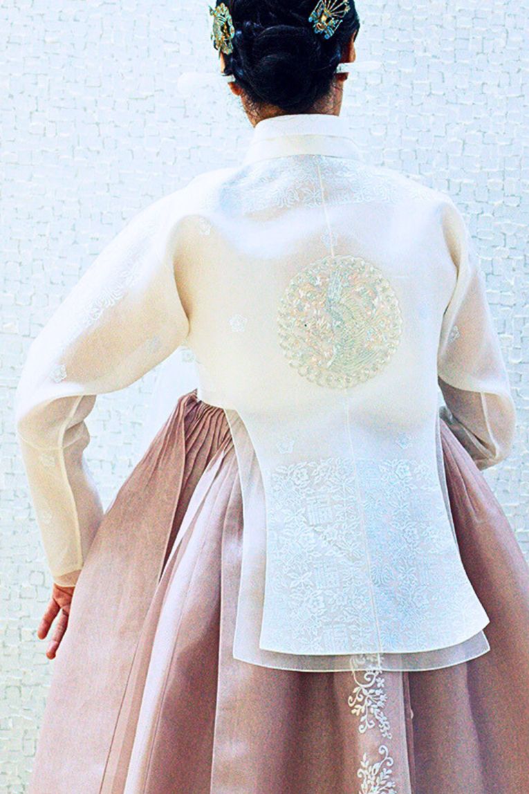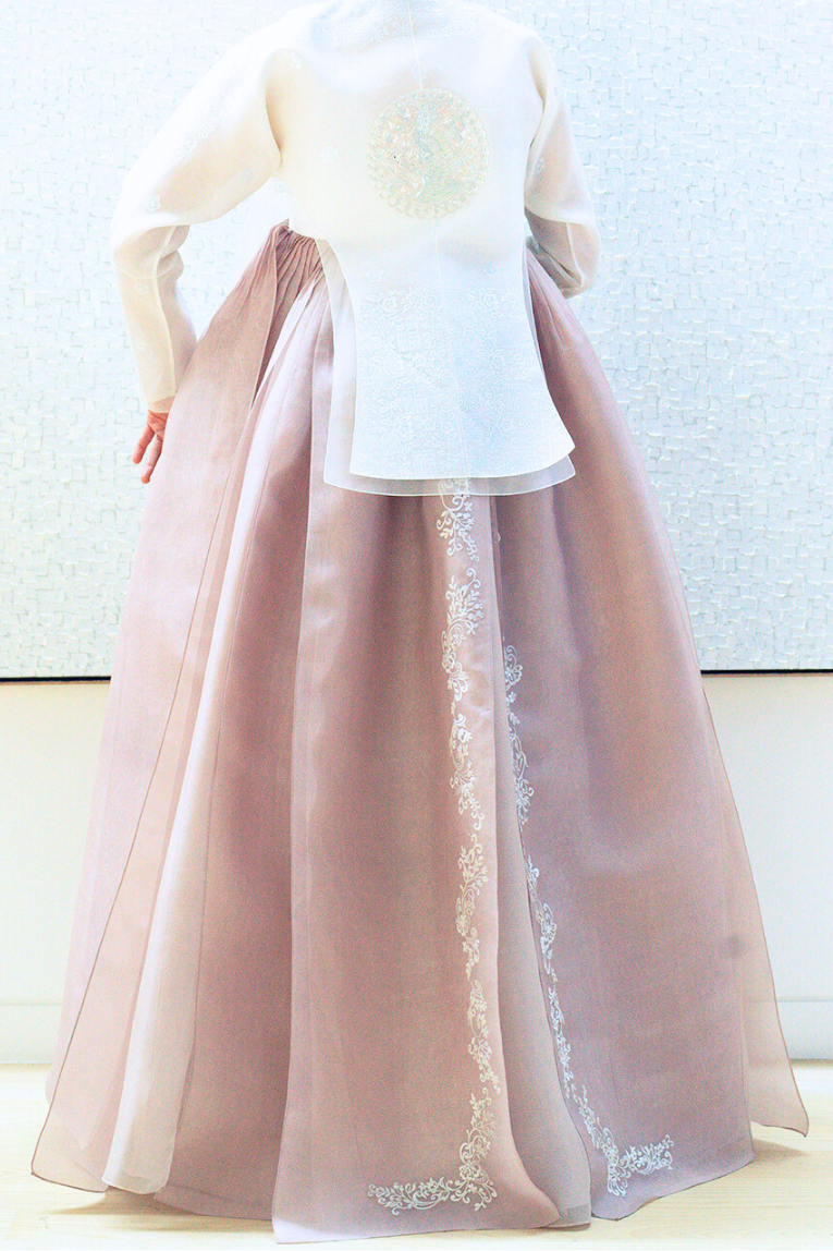 White long sleeved dangui (top) & Double layered panel skirt with embroidery on back